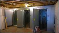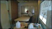 Hand made counter and bathroom doors. Some beams were hidden in the ceiling and in the kitchen area moved to the east wall to give the interior an open look.